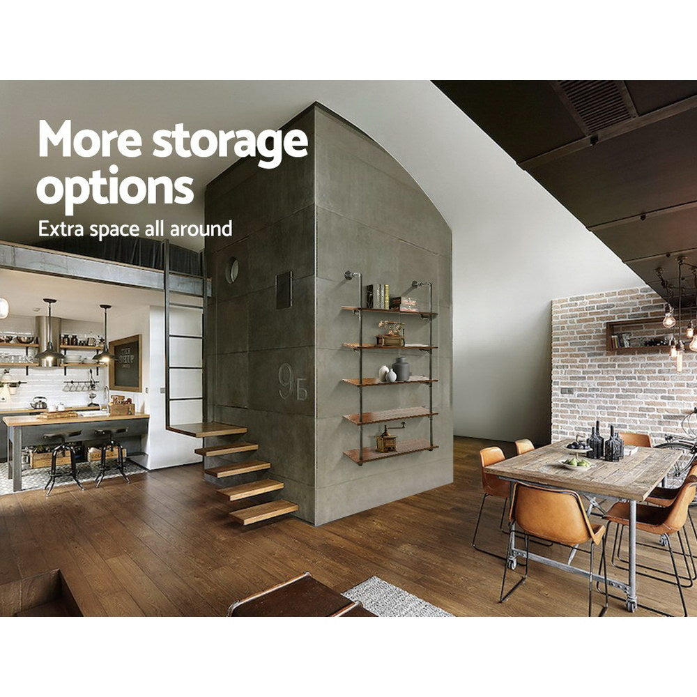 With its cool vibes the Artiss 5-tier pipe shelf is full of character and practicality. Use it to create more storage space in the home in the garage in the cafe or just about anywhere where empty space is available on a wall. Made from quality pine wood and strong metal pipes the entire ensemble is strong and durable. Each 2cm thick shelf has a weight capacity of 10kg and meticulously finished for flawless looks and style. Not least the metal pipes are each 25mm in diameter and 1.3mm thick and given a bold appearance for better authenticity.