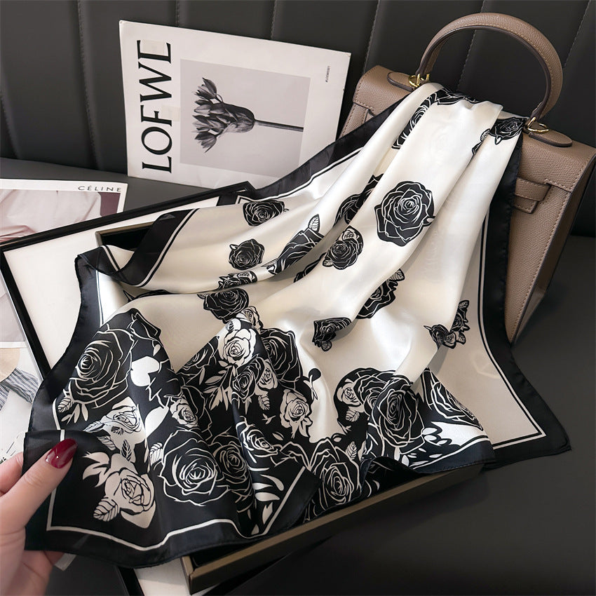 Black Pure Silk Scarf Elegant Flower Design, Square Handkerchief (Style 10) Scarves & Wraps
