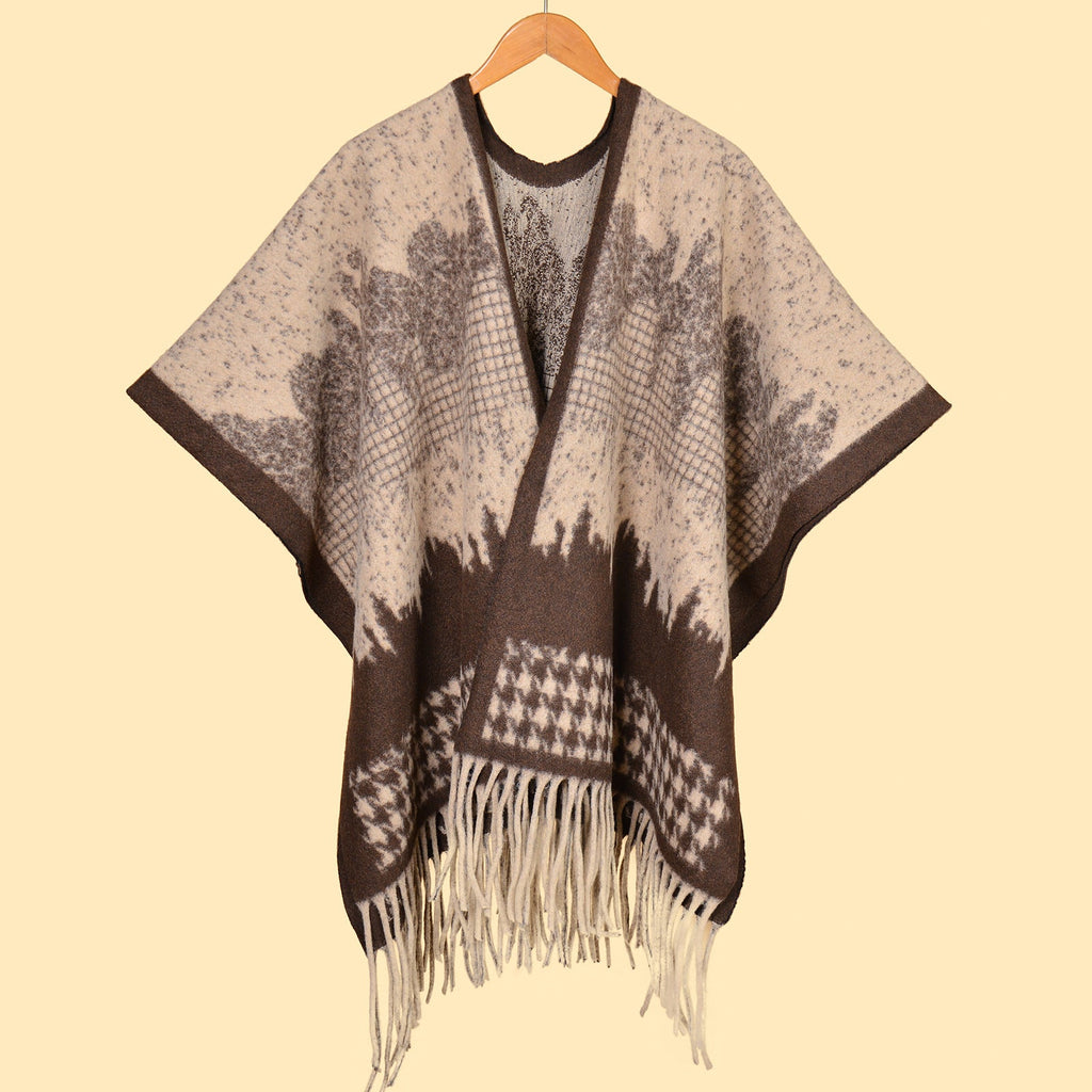 Far Hills Chidori Coffee Elegant Autumn Winter Shawl Artistic Split Design Knit Cloak With Oil Painting Style Scarves & Wraps