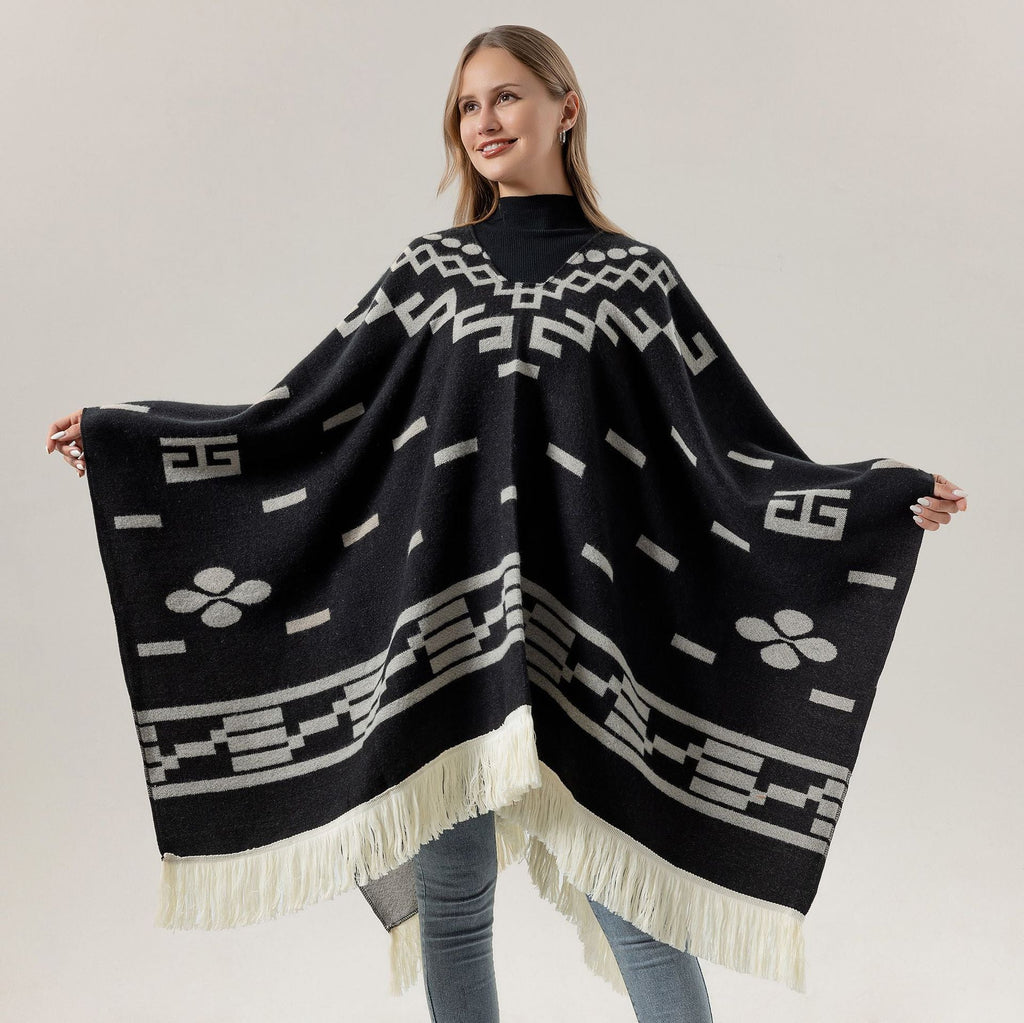 Women's Versatile Faux Cashmere Poncho Cape Shawl With Geometric Pattern Fringe Trim