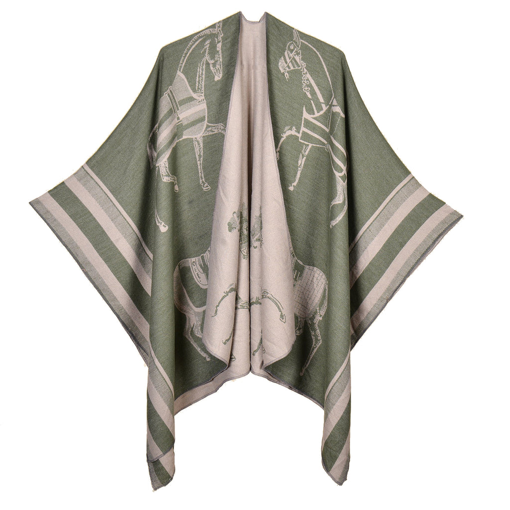 War Horse Green Elegant Autumn Winter Shawl Artistic Split Design Knit Cloak With Oil Painting Style Scarves & Wraps