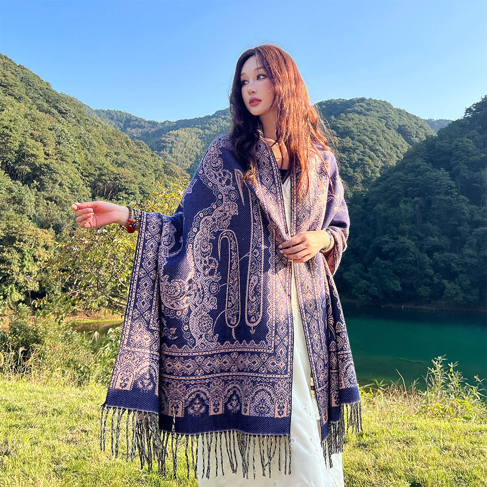 Womens Ethnic Faux Cashmere Shawl Wrap Jacquard Pattern Tassel Scarf A Unique Hole Purple Scarves & Wraps
