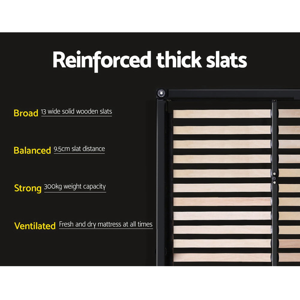 Constructed with a sturdy steel frame that's reinforced with metal bars and heavy-duty connectors the Avio Bed Frame is also padded with high density foam and upholstered in premium faux linen fabric for a soft and comfortable touch. The Bed Frame features a arched slat base that helps to distribute weight evenly across the frame and a centre support strut to provide added stability to the overall structure.