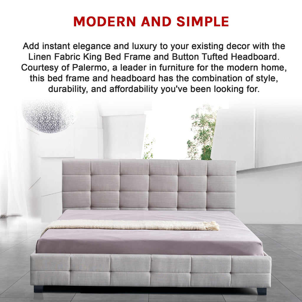 • 1 x Linen Fabric King Bed Frame with Button Tufted Headboard (Mattress and linens not included)