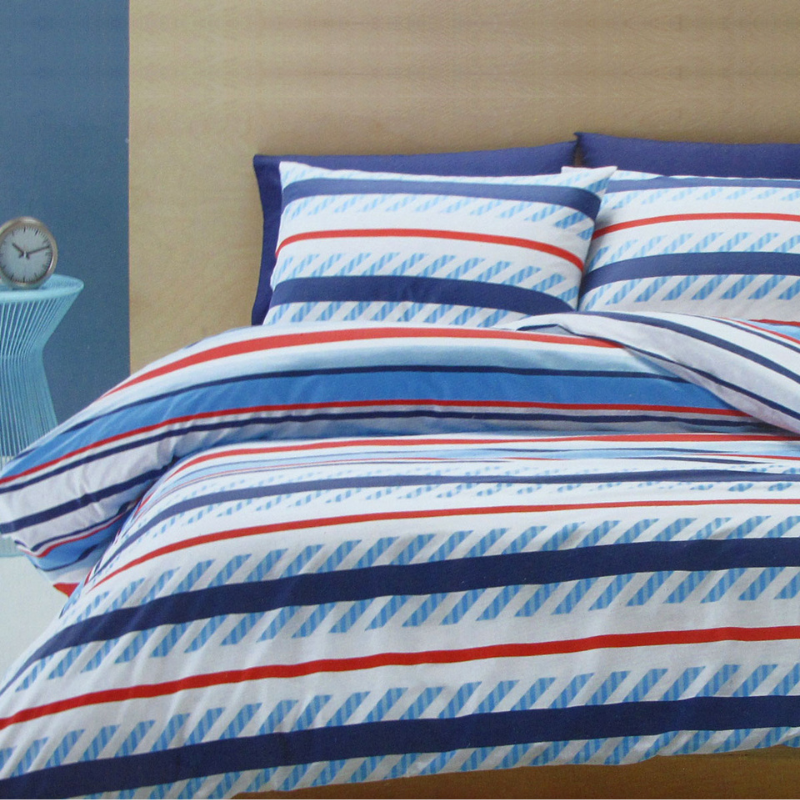 This Atlanta Striped Easy Care Quilt Cover Set by Belmondo will give your bedroom a quick and instant face lift without breaking the bank. The quilt cover features a stylish stripes design printed in white blue navy and red that will give your bedroom an upbeat vibe. It is made from quality and soft touch polyester cotton fabric with easy care properties you can enjoy for years to come.