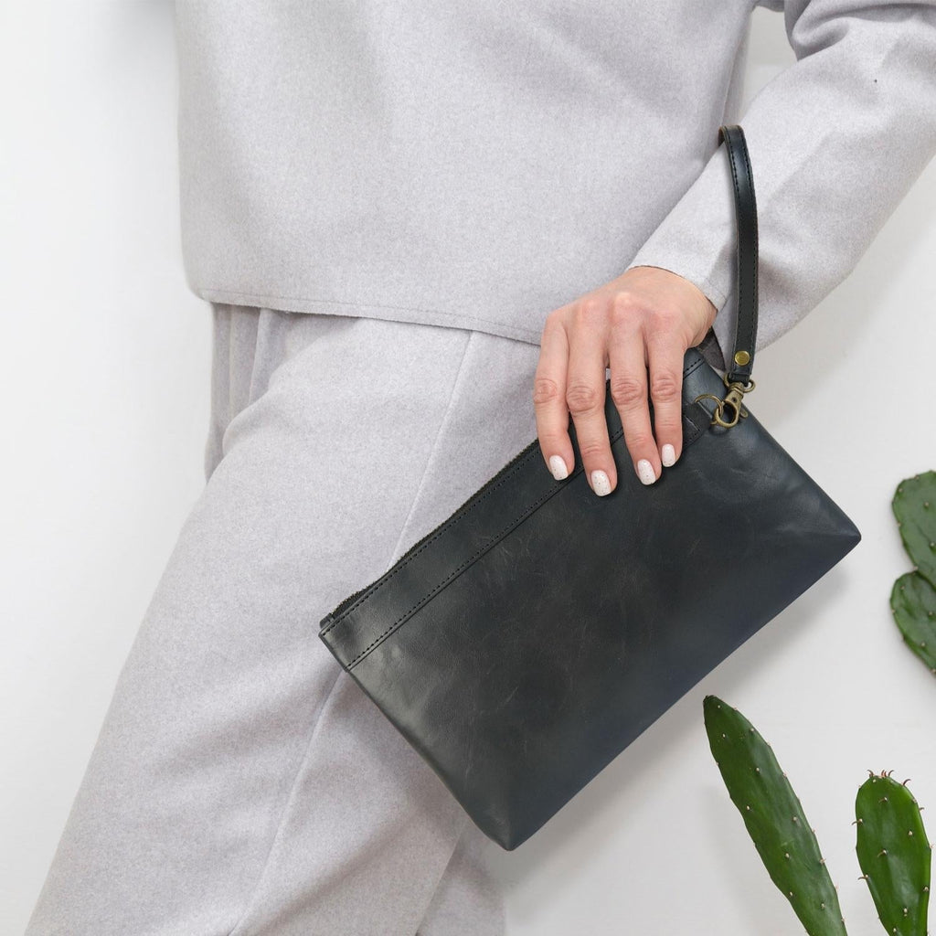 Leather Envelope Clutch With Zipper Closure Dark Blue Wallets