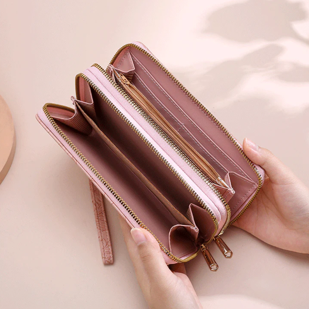 Elegant Floral Embossed Long Wallet With Double Zipper - Pink Wristlet Design