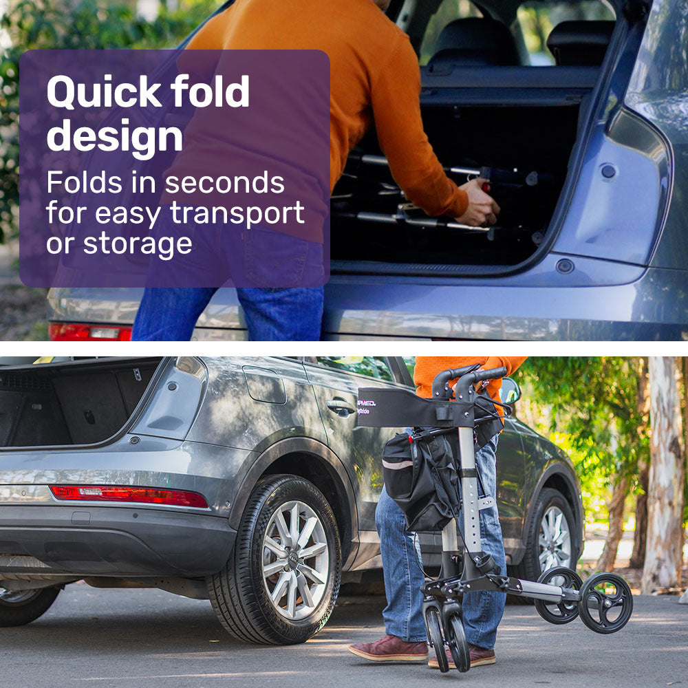 Venture outside on the large 8 #8221; wheels which are designed to roll smoothly over the bumps inside and outside and have reflectors for peace of mind. The comfortable seat with padded back rest comes in handy when you #8217;ve found a pleasant spot to watch the world go by or perhaps simply feel like a rest when waiting in line. Simply push the handles down and the walker is locked into place.