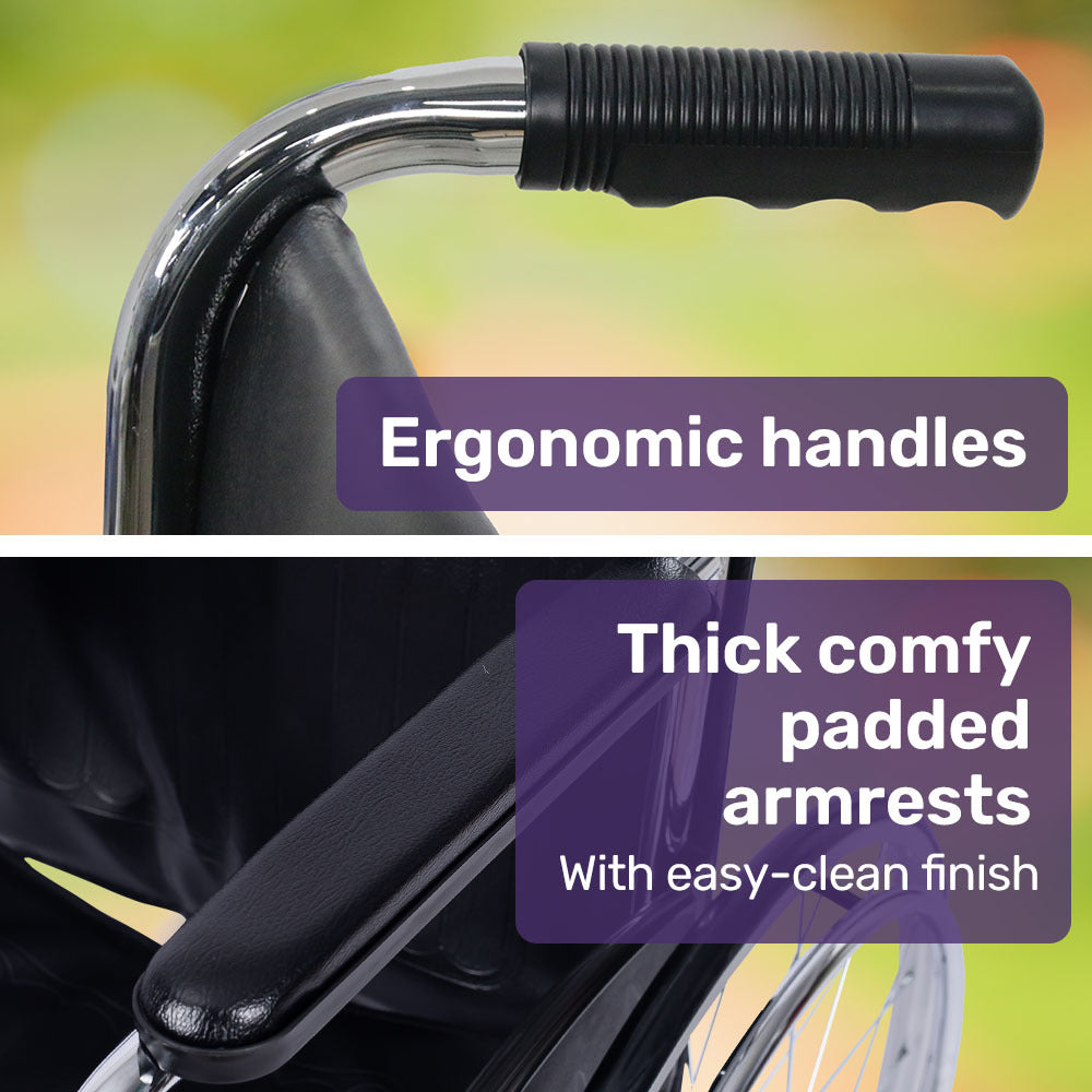 Practicality Reliability And Comfort Is Required To Provide Well Deserved And Confidence. This Premium Wheelchair Has A Sturdy Steel Frame With A Stylish Chrome Finish That Can Hold Up To 100Kg.