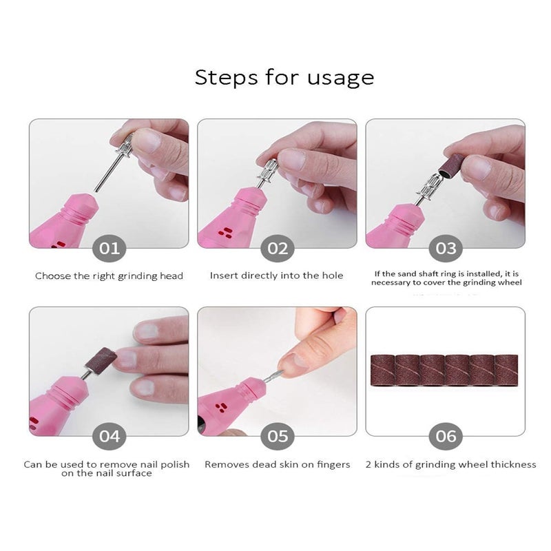 (Multifunction):Nail Drill With 6 Optional Bits/Filing Heads (With 6 Sanding Bands) That Effectively Smooth Corns And Calluses Removing Excess Cuticles And Filing Shaping And Buffing Nails. Easy Attachment Change. No Tools Needed For Inserting Or Removal Of A Bit