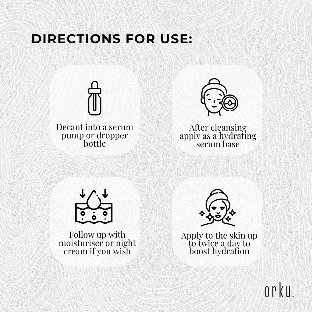 Directions For Use:Decant Into A Serum Pump Or Dropper Bottle And Use After Cleansing As A Hydrating Serum Base. You Can Then Follow Up With Moisturiser Or Night Cream If You Wish.
