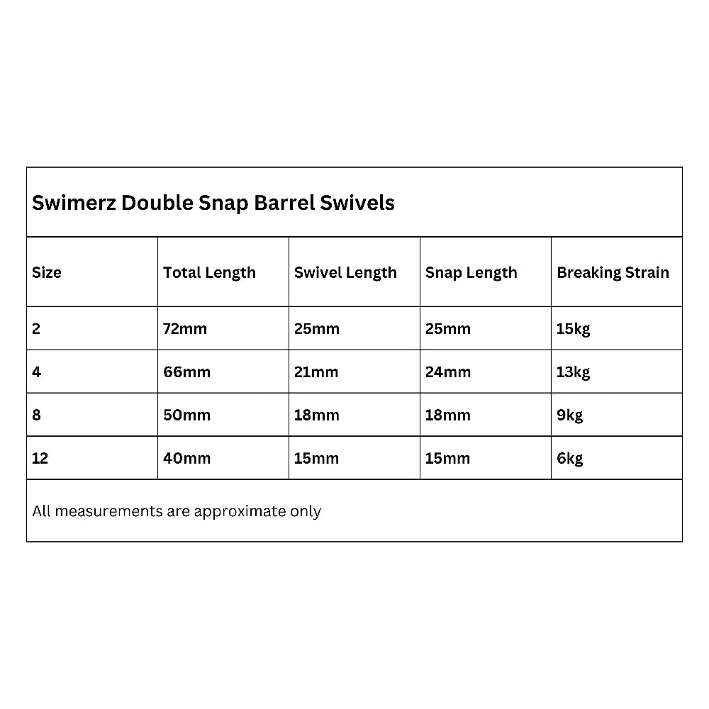 Swimerz Double Snap Barrel Swivels Are Ideal Where A Double Or Lure Attachments Are Needed With Multiple Sizes Available For A Variety Of Pelagic Species. The Barrel Swivel With 2 Snap Swivels Provide A 360 Degree High Speed Rotation.