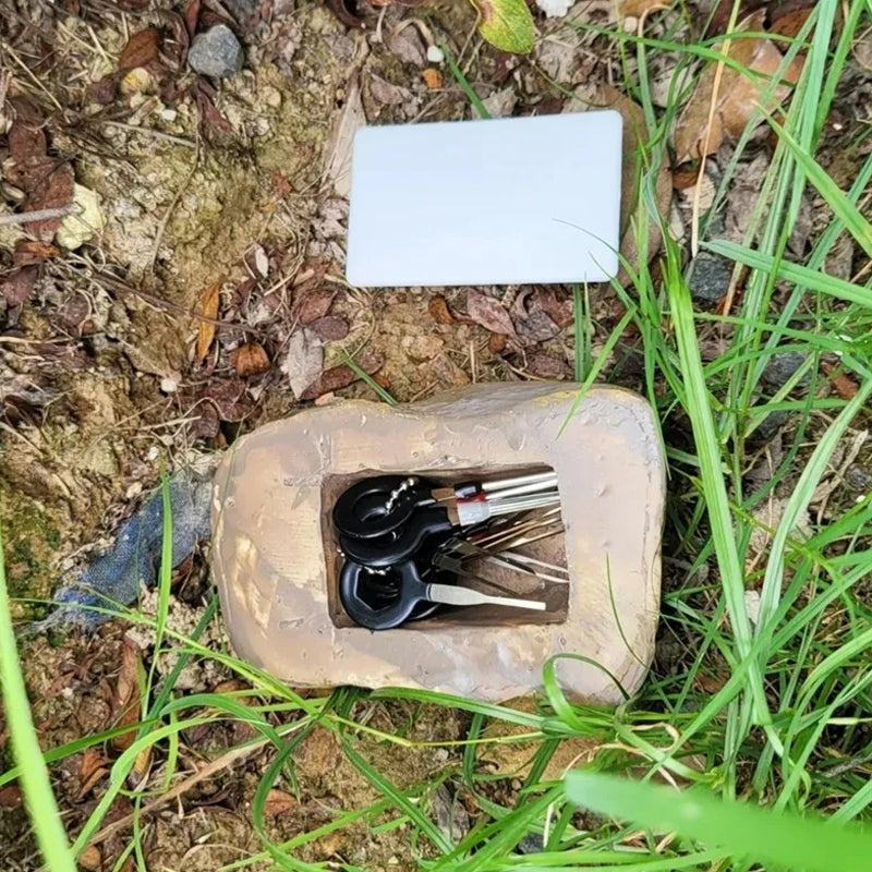 Product Description This is an outdoor key hider that looks just like well a rock. The key rock has a smooth slide-to-close secure cover that blends in with the rock in your garden and can accommodate multiple keys at once. The rock key hiders can be placed at a certain location outside your house which you can share with your family and let them go inside your house during emergencies so you don’t have to duplicate your house keys and distribute them to your family. It is made out of molded poly-resin material that matches real rocks in size shape texture color and weight. The rock key hider is also weatherproof and windproof and can withstand different weather conditions.