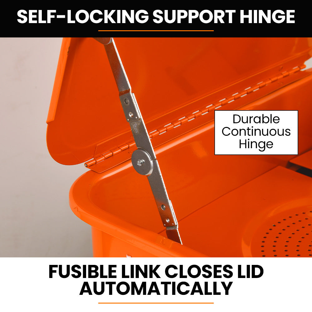 • Lid Support Is On A Fusible Link And Will Auto-Close To Extinguish Flames