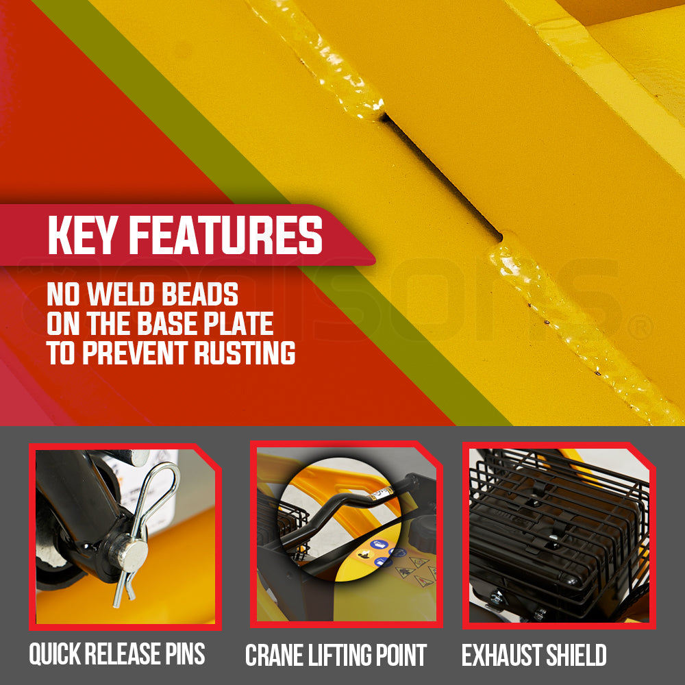 The high-power design combined with a serious 111kg max operational weight and solid one-piece prime strength steel plate guarantees firm level soil compression. Tapered edges of the base plate offer optimal manoeuvrability so you’ll be able to make light work of compacting sand soil and gravel in confined spaces.