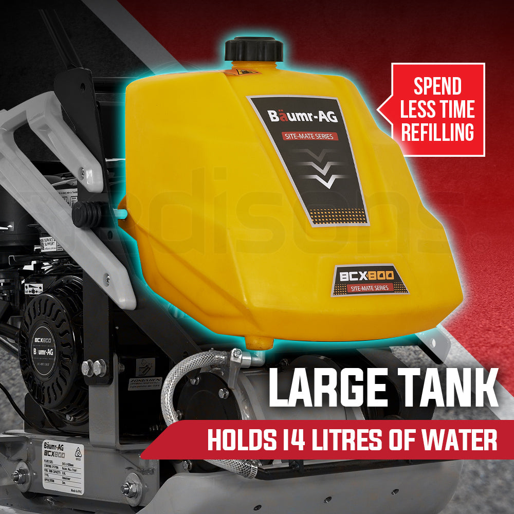 Take one look at the Baumr-AG BCX800 Site-Mate Series Plate Compactor and it’s plain to see that this is a truly next generation design. With high-tech manufacturing employed from the ground up the BCX800 is of course precision robot welded to provide maximum strength and inhibit rust. Encased in the protective frame is a class-leading easy-start air-cooled 7HP 4-Stroke engine that is tough reliable and efficient.