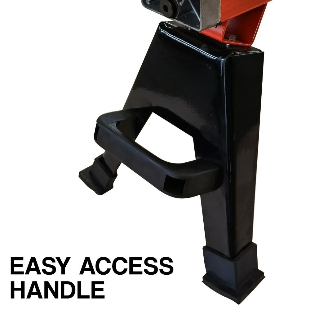 There are two wide- front legs for stability and durable six-inch wheels for easy transportation. Simply pick one end up by the handle and the unit tips back onto the wheels. It can even be safely operated on a bench. How's that for flexibility