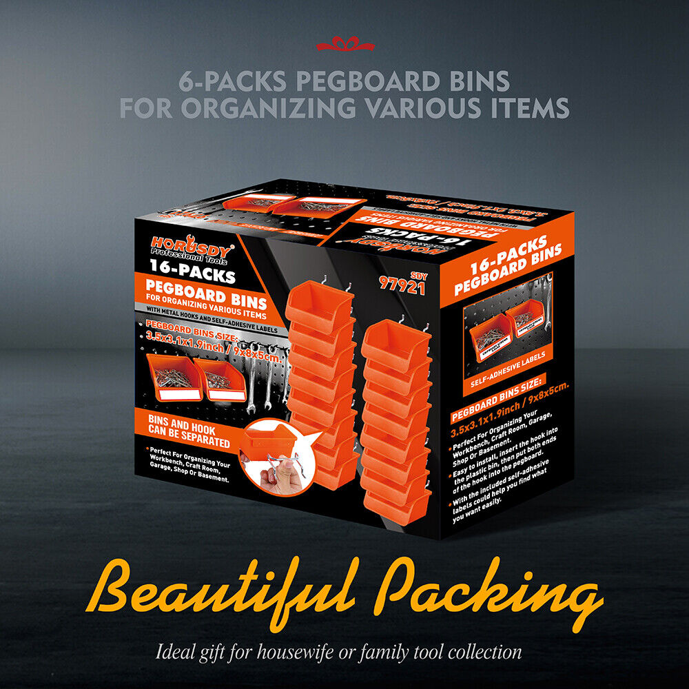Horusdy 16Pc Pegboard Bins Board Parts Storage With Steel Hooks Tools Organiser Tray Other Tool Storage