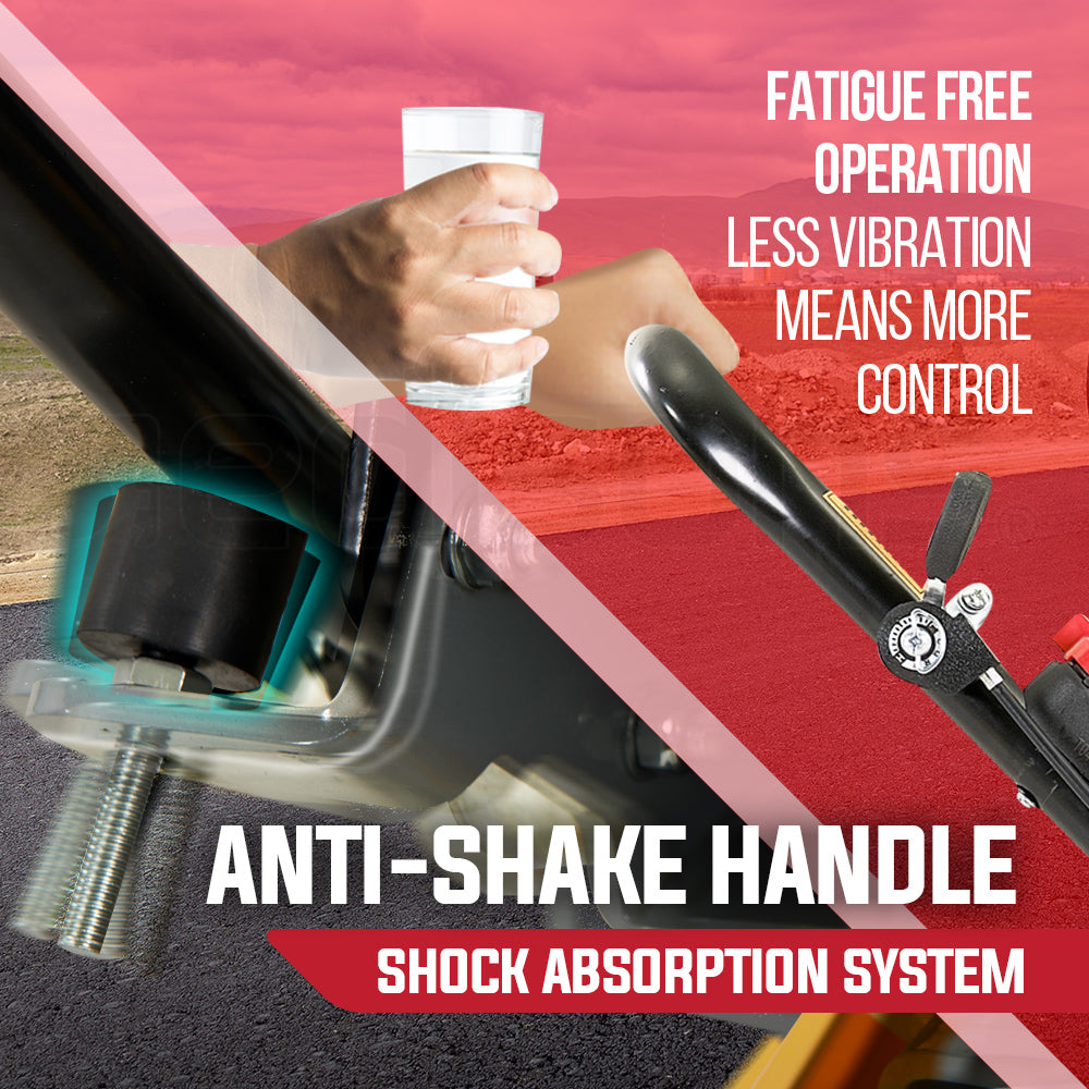 An integrated sprinkler system connected to a large 14L water tank ensures the base plate is kept cool and asphalt adhesion is minimised. Operator comfort is assured by the oversized shock-absorption system integrated into the handles. Unlike other models on the market transport from job-to-job is no fuss thanks to the retractable wheels and there is also a lifting hook incorporated into the frame.