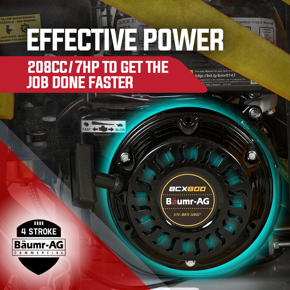 Take one look at the Baumr-AG BCX800 Site-Mate Series Plate Compactor and it’s plain to see that this is a truly next generation design. With high-tech manufacturing employed from the ground up the BCX800 is of course precision robot welded to provide maximum strength and inhibit rust. Encased in the protective frame is a class-leading easy-start air-cooled 7HP 4-Stroke engine that is tough reliable and efficient.