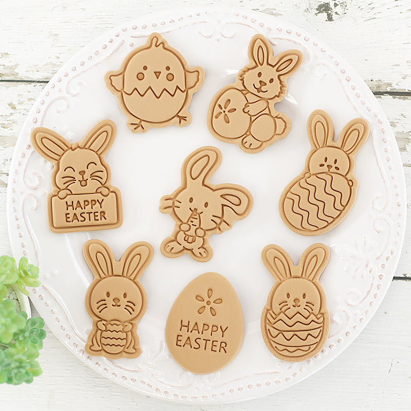 • 8 unique 3D Easter-themed cookie cutters in the shape of bunnies rabbits and eggs