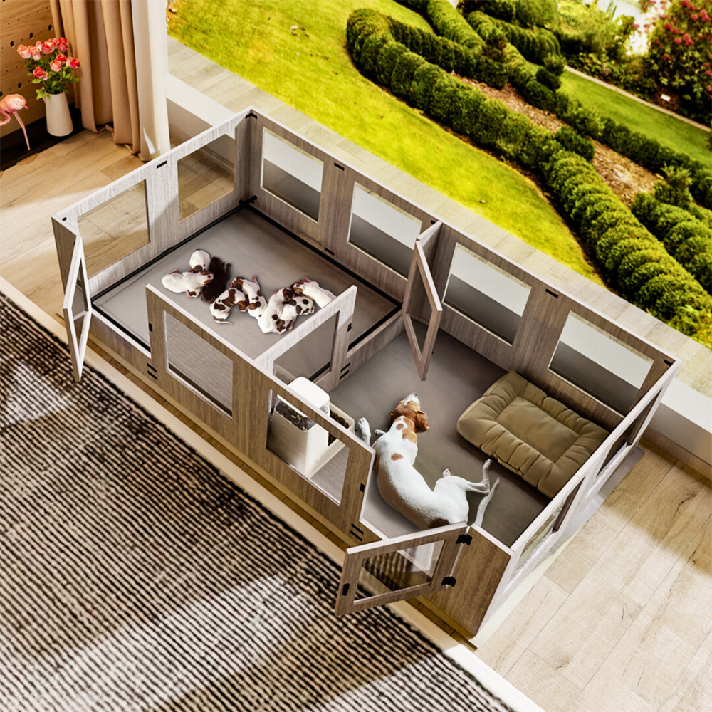 Inside The Pen Box Is Divided By A Central Door Panel Into Two Distinct Areas. One Section Is Designed For The Dog Mom Providing A Comfortable Space For Her To Rest And Stretch While The Other Is For The Newborn Puppies Allowing Them Ample Space To Move Around And Sleep. Both Sections Are Equipped With Waterproof Fertility Pads Which Make Cleanup Simple And Prevent Messes From Reaching The Floor. This Layout Ensures That The Mother And Her Puppies Have Their Own Space Fostering A Sense Of Security For The Newborns Without Disturbing Each Other.