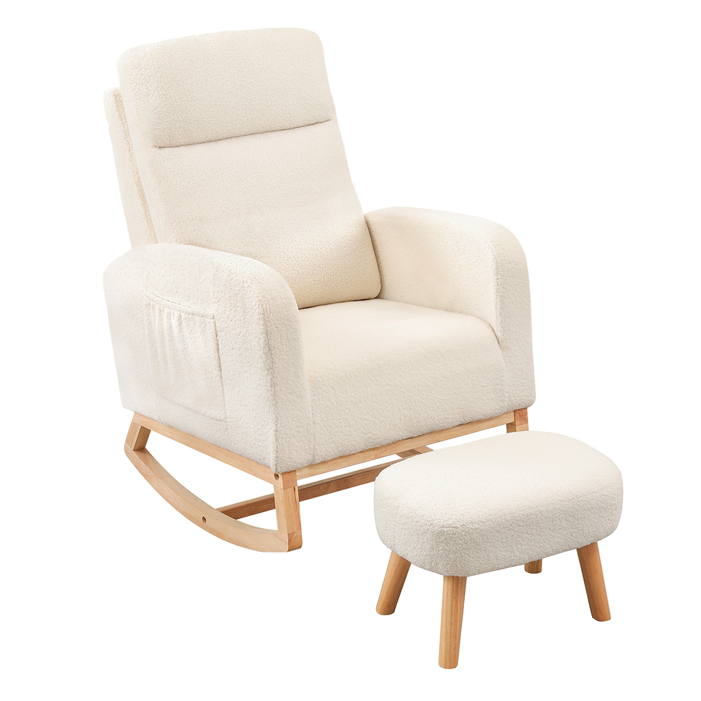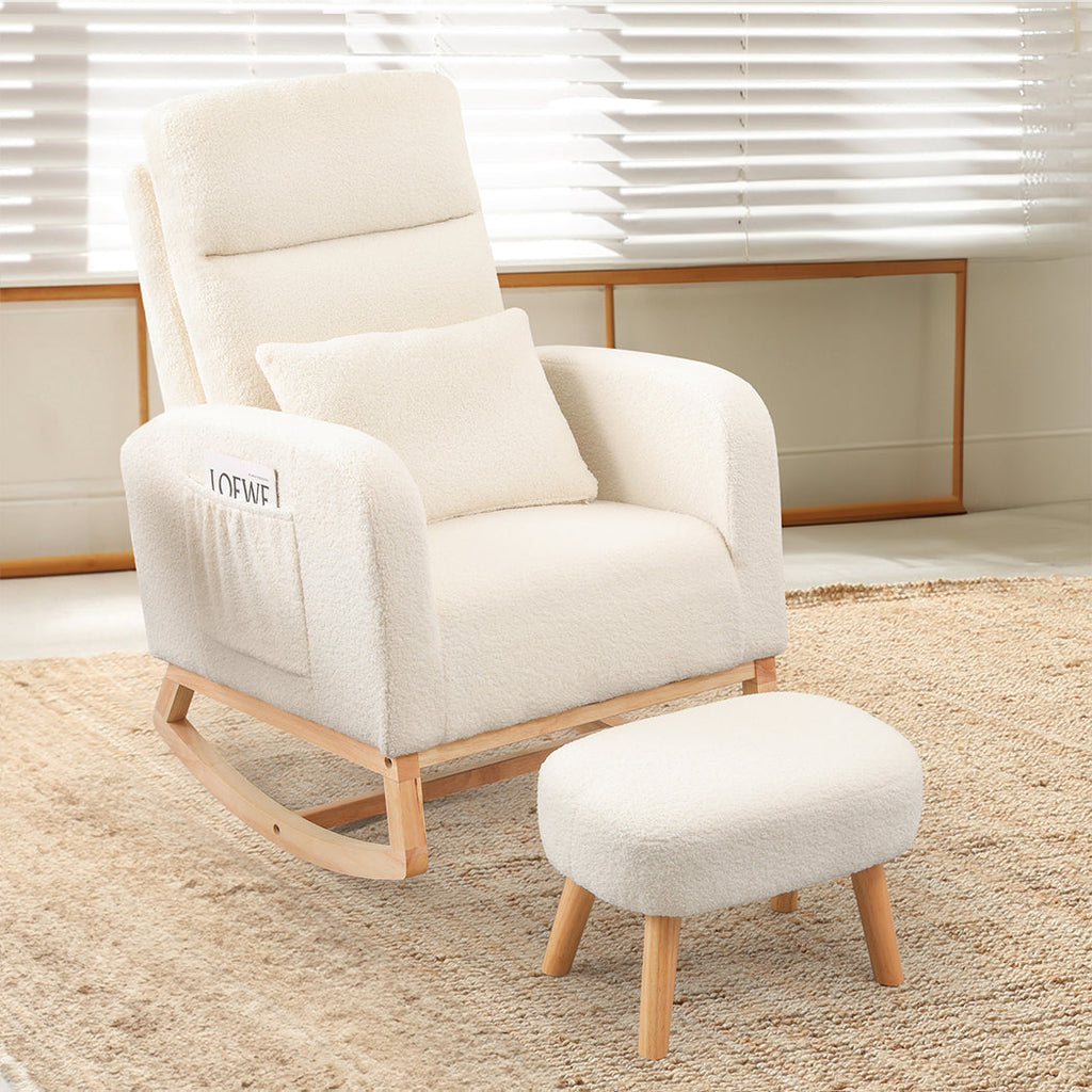 Relax In Ultimate Comfort With The Levede Rocking Chair And Ottoman Footrest Set. Upholstered In Soft Teddy Bear Plush Fabric And Filled With High-Density Foam This Set Provides Outstanding Comfort And Lasting Resilience. The Ergonomic Design Featuring A High Backrest And Wide Armrests Offers Excellent Body Support For Adults Seeking A Cozy Spot To Unwind. The Gentle 15° Rocking Motion Creates A Soothing Experience Whether Reading Relaxing Or Spending Quality Time With Your Little One. Its Minimalist Stylish Look Makes It A Versatile Addition To Any Room Blending Comfort Support And Modern Elegance.