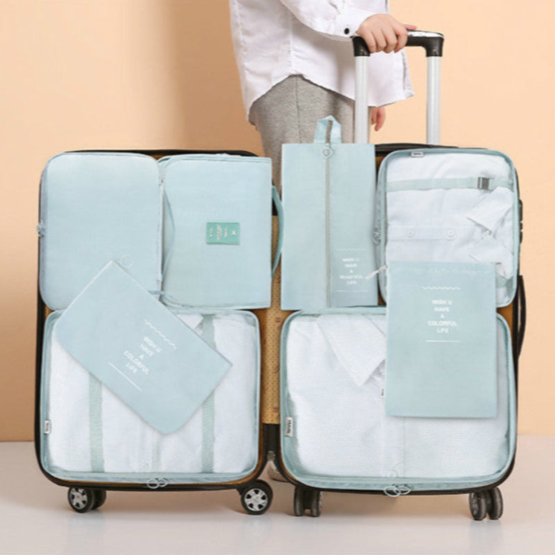 Blue Travel Packing Cube Set - Seven-Piece Luggage Organiser for Effortless Packing Streamline your travel packing with thisstrong>Travel Packing Cube Set. Designed to maximise luggage space and keep your belongings neatly organised this seven-piece set includes a variety of bags for clothes toiletries and accessories. Whether you are packing for a weekend trip or an extended holiday this set ensures hassle-free and efficient packing. Key Features: