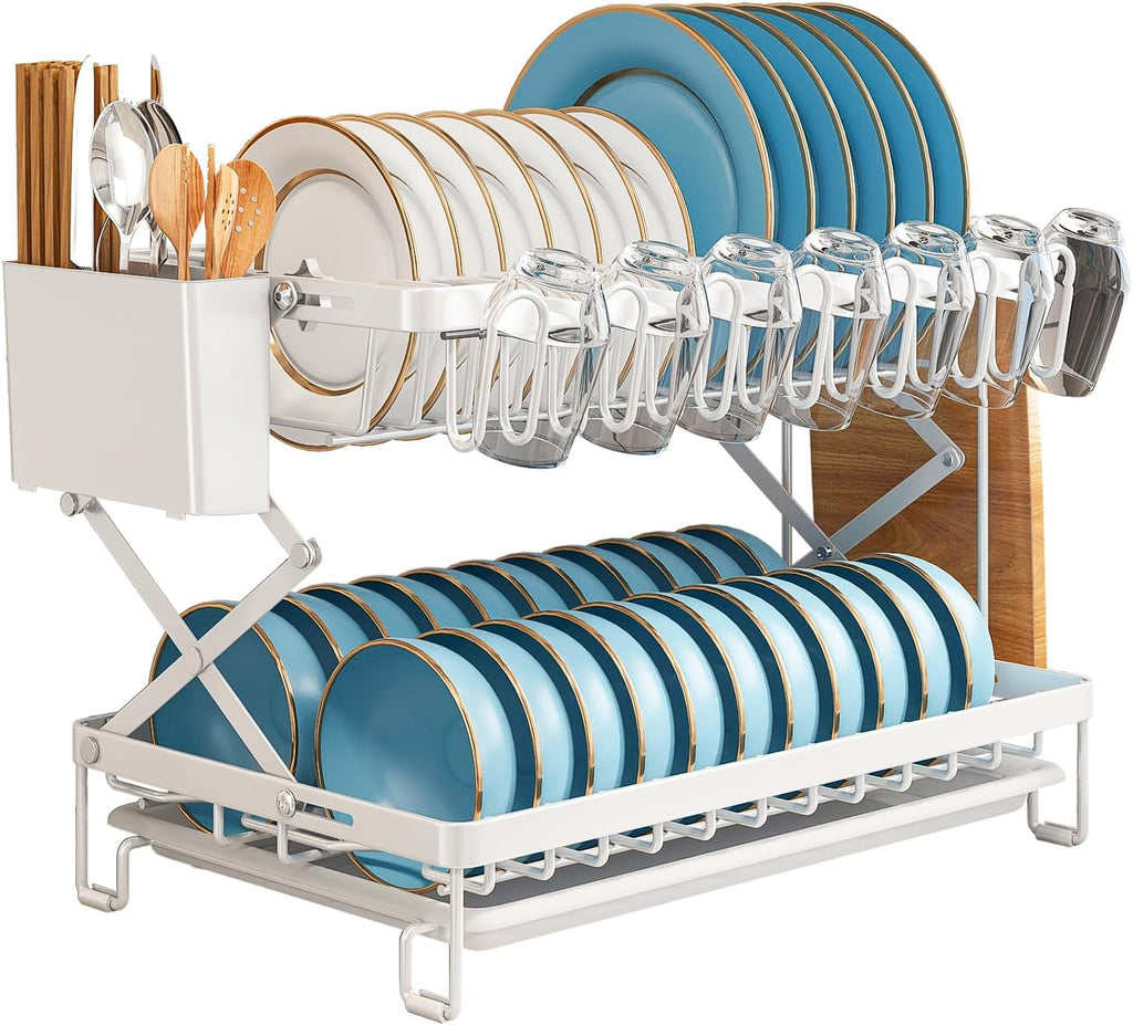 Carla Home 2-Tier Dish Drying Rack With Drainage Tray Utensil Holder Cup Hooks Cutting Board Rack (White)