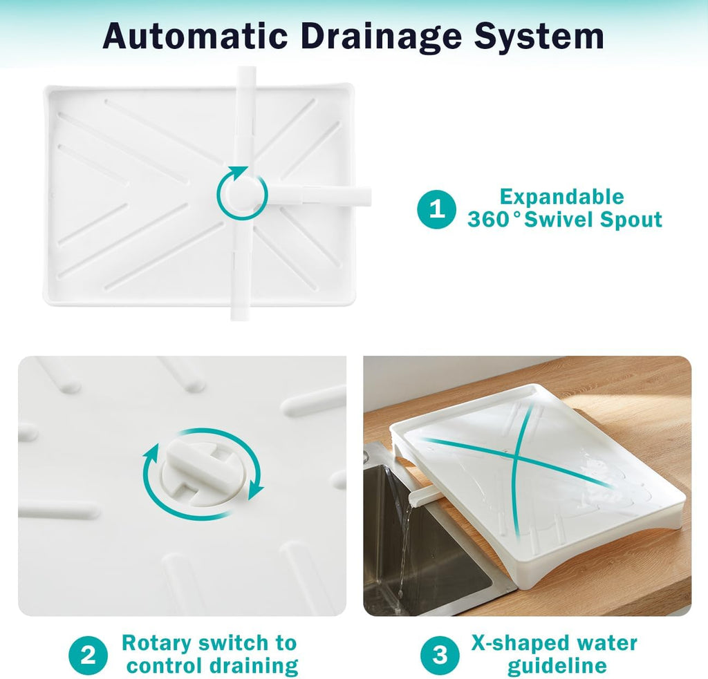 - Built-In Drainboard With Swivel Spout: Auto-Drain Tray With 360° Rotating Spout Channels Excess Water Directly Into The Sink Keeping Your Countertop Clean And Dry.