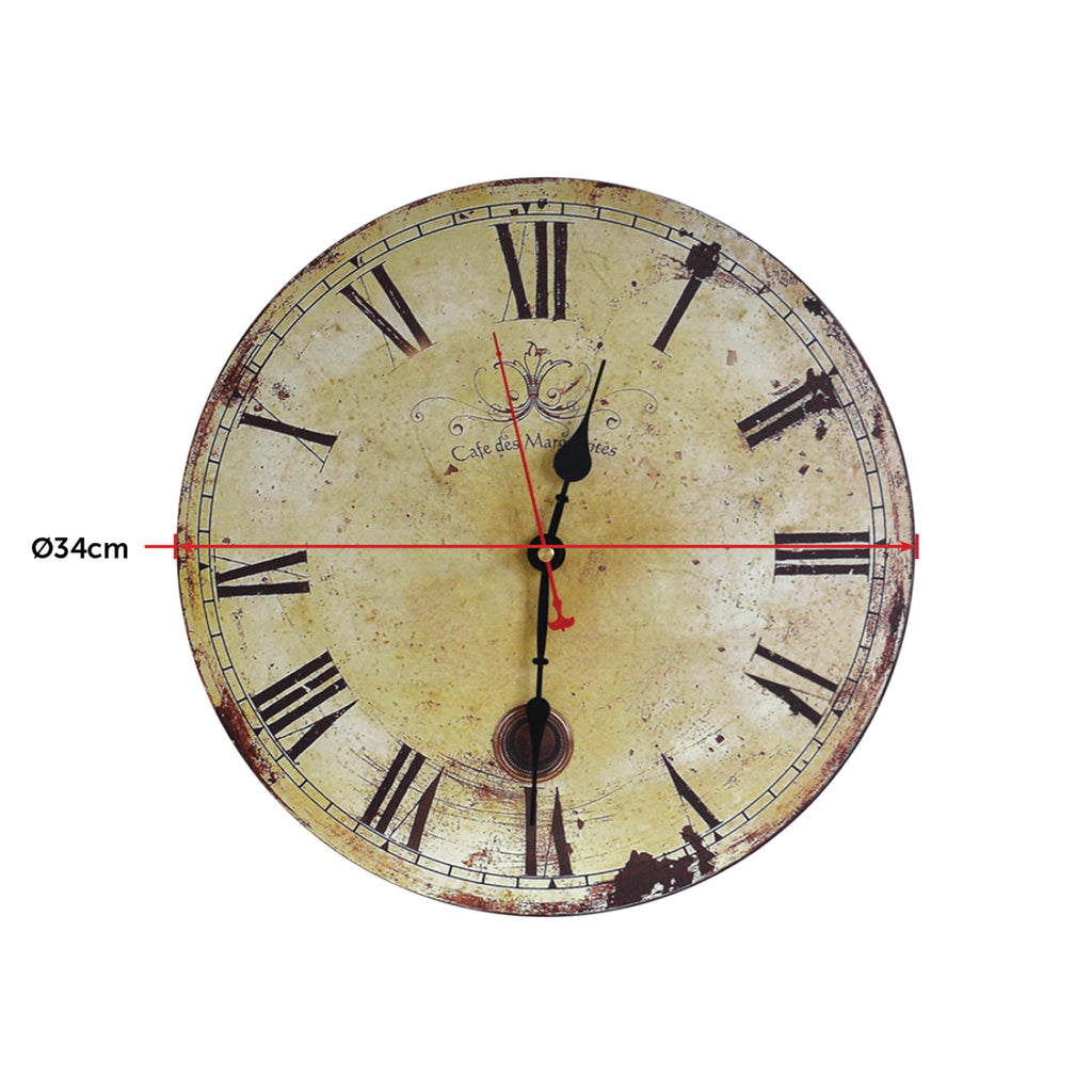 P>Crafted From High-Quality Mdf And Manufactured Wood This Clock Is As Durable As It Is Beautiful. With This Timepiece You Get Old-World Charm With Modern Dependability. Its French Inscription a‚¬EœCafA© Des Marguerites' Turns Your Room Into A French CafA© From Yesteryear. Hand-Crafted By Traditional Artisans No Two Are Alike. Its Character And Heirloom Quality Make It A Piece Your Family Will Treasure For Generations.P>Easy To Read From Even Far Away The Roman Numerals Provide You With Accurate Time While Adding To The Character Of The Piece. It's Easy To Install And Easy To Maintain. Simply Replace The Aa Batteries When They Stop Working And Give It An Occasional Wipe With A Damp Cloth To Keep It In Great Shape For Years To Come.P>Buy One For Your Home And Another For A Gift. Get Yours TodayP>Features And Specifications:Ul>Li>Dimensions: Diameter Of 34CmLi>Weight: 1.45KgLi>Power Source: Aa BatteriesLi>Materials: Mdf And Engineered WoodLi>Numbering: Roman NumeralsLi>Easy To Install And CleanLi>Artisan-Crafted For Top Quality/Ul>OUR GUARANTEE: