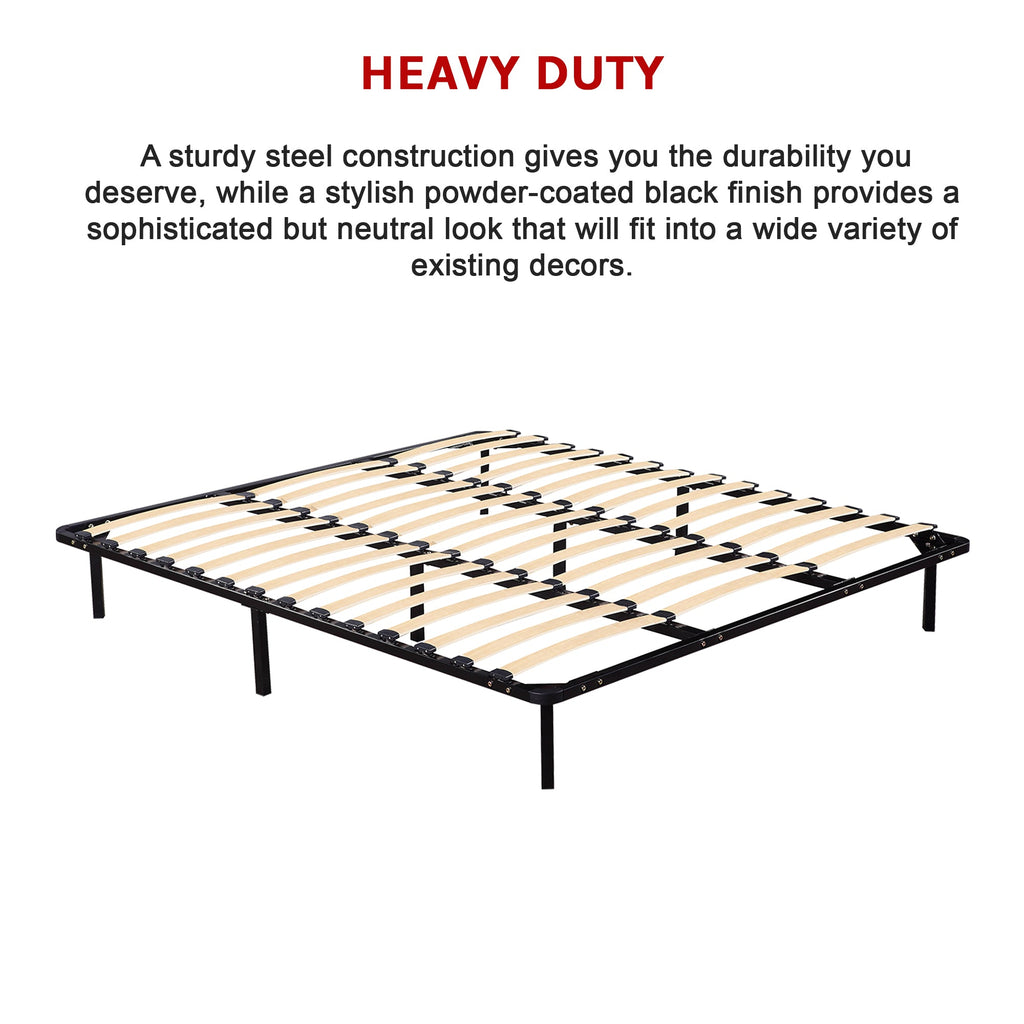 P>This Item Can Be Asembled In 10 Mintues (Assembly Instructions Provided) And Takes Up Very Little Room When Dissassembled And Stored.P>Simple And Tasteful And At A Price That's Right The Steel King Bed Frame With Black Finish Is Where Style Meets Sweet Dreams.P>Features Of The Steel King Bed Frame With Black Finish:Ul>Li>Dimensions Of Frame: 183 X 203 X 30 Cm (W X L X H)Li>Steel Construction With Powder-Coated Finish In BlackLi>Simple Modern DesignLi>Easy To Assemble; Instructions IncludedLi>Post Leg Diameter: Ø38*1.0Mm Height: 25CmLi>Bed Base Crossbar: 30 X 40 X 1.00 MmLi>Side Rail: 30 X 30 X 1.2MmLi>Gross Weight: 25KgLi>Weight Capacity Approx 500Kg (Static Loading Conducted In Factory)Li>Designed For Standard Australian Sized King Mattress: 183 X 203 Cm MattressLi>Please Note: Mattress Arnd Are Not Included/Ul>P>Attributes: