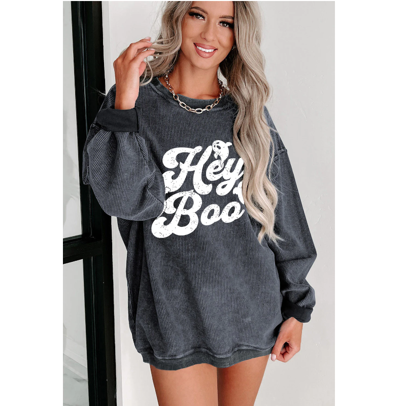 Gray Corded Hey Boo Ghost Graphic Drop Shoulder Halloween Sweatshirt L Hoodies & Sweatshirts