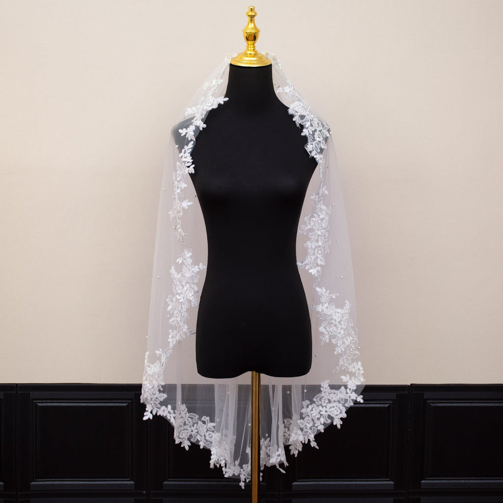 - 1 X Long Bridal Veil With Scattered Pearls Lace Edge Metal Comb
