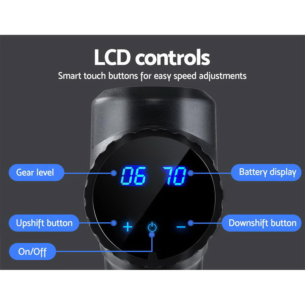 Chronic muscle pains? Hardcore gym junkie? Office job with long working hours? Recovering from an accident? Whatever your situation our Everfit Percussion Massage Gun provides customised in the comfort of your own home without the need to visit luxury spas. The powerful 20V brushless high-torque motor with closed-loop control operates quietly and provides rapid bursts of pressure penetrating 12mm deep into your muscle tissues at up to 4000 percussions per minute. The massage gun is powered by a rechargeable lithium battery that lasts up to 8 hours so that you can forget to recharge once in a while and the non-slip rubber handle provides a comfortable grip to reduce hand fatigue. Percussion speed can be easily adjusted using the intuitive LCD display with smart touch controls and there are 30 speed levels to suit various purposes from simply waking up your muscles to relieving lactic acid and assisting muscle recovery after exercising or even intense professional-level massages. And with the six interchangeable head attachments for targeted relief (round fork flat Pneumatic and conical heads) you are ensured of a fully customised massage.