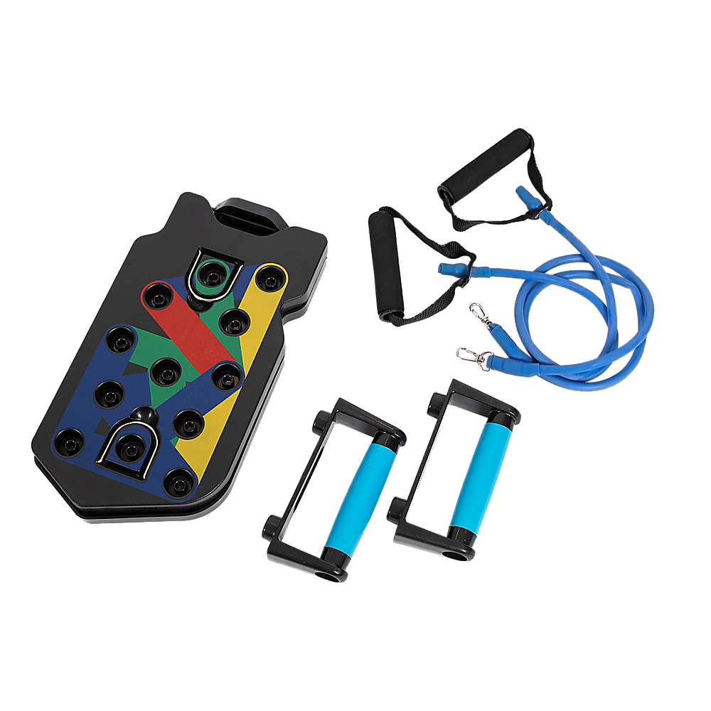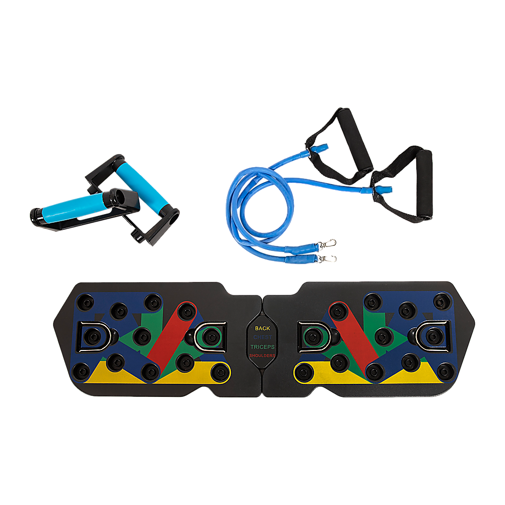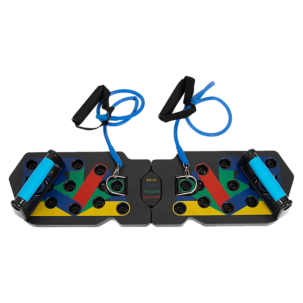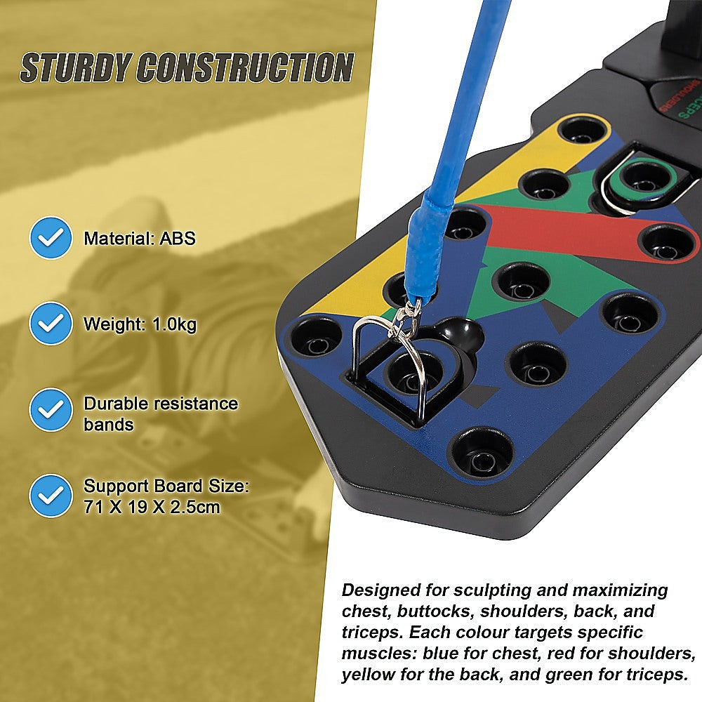 Experience The Advance And Enhanced 13-In-1 Push Up Bars With Resistance Bands. Designed For Sculpting And Maximizing Chest Buttocks Shoulders Back And Triceps. Each Colour Targets Specific Muscles: Blue For Chest Red For Shoulders Yellow For The Back And Green For Triceps.