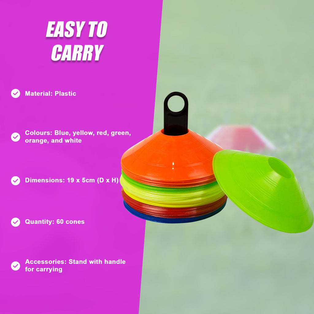 Unlike Most Markers Or Cones This Set Of 60 Cones From Randy Travis Machinery Are Durable And Brightly Coloured Making Them Especially Valuable Training Aids For Younger Players Who Often Are So Focused On Learning Their Skills That They Don't See The Markers. They're Perfect For Teaching Agility And Speed In Basketball Soccer Hockey Players Or Any Other Athlete Whose Sport Requires Quickness Of Foot Quick Starts And Turns. Crafted From Forgiving Yet Tough plastic These Cones Can Take All Your Athletes Give Out Yet Give Easily To Prevent Injury In Case Of A Collision. They're Stackable And Come With An Easy-Carry Stand With A Handle So You Can Carry It Easily From Your Home Or Office To The Sports Venue. Don't Start The Next Season Without These Cones. Get Yours Today