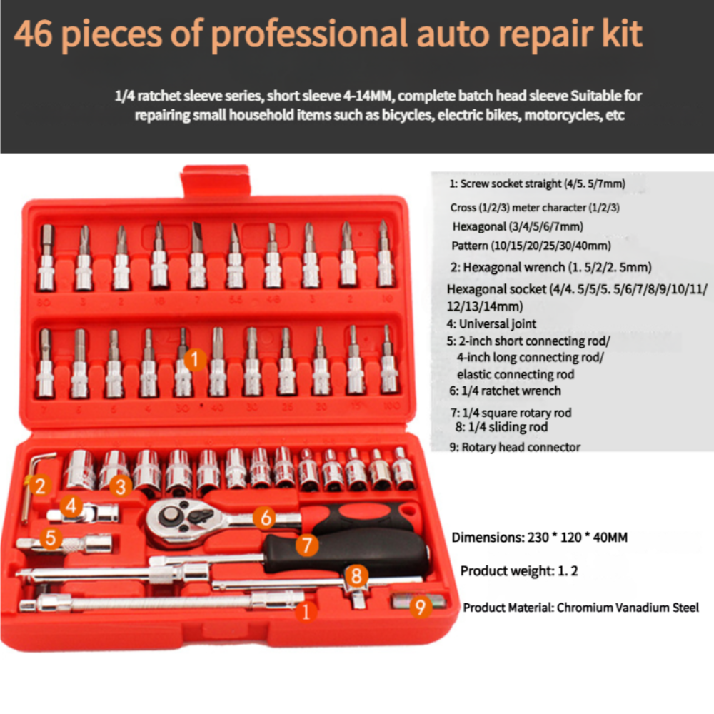 Tackle Any Repair Task With This 46-Piece Professional Socket Wrench Set. Designed For Automotive Bicycle Motorcycle And Home Repair This Comprehensive Kit Features High-Quality Chrome Vanadium Steel Components And A 72-Tooth Ratchet Wrench For Precision And Efficiency.