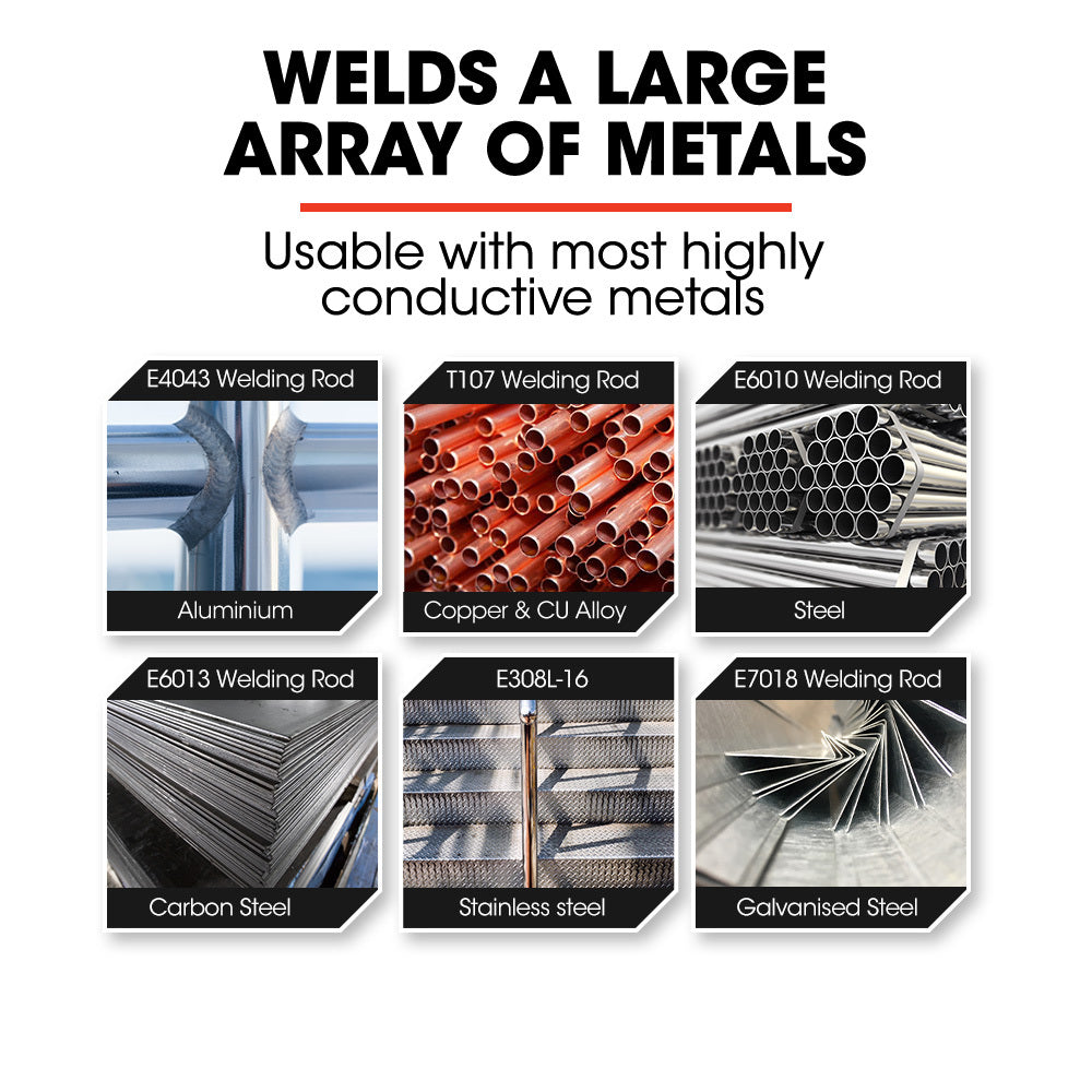 • Compatible Metal And Electrode: Aluminium (E4043) Copper (T107) Steel (E6010) Carbon Steel (E6013) Stainless Steel (E308l-16) Galvanised Steel (E7018)