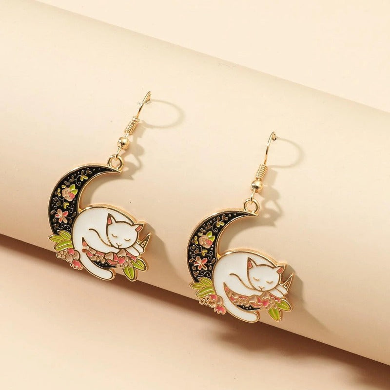 1 x Cute Cat with Black Moon and Flower Dangle Earrings Aesthetic Drop EarringsOUR GUARANTEE: