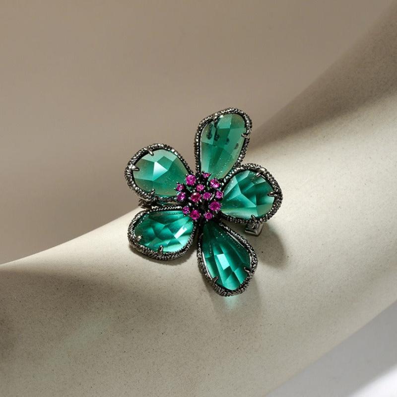 Veile Studios S925 Silver Framed Hot Pink Pistil Turquoise Blue Rhinestone Flower Earrings Ring Brooch Female Fashion Jewellery Jewellery Sets