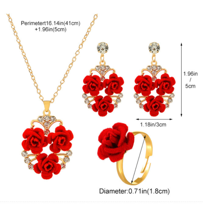 4Pcs/Set Romantic Lovely Red Rose Flower Inlaid Rhinestone Pendant Necklaces+Dangle Earrings+Ringfor Women Valentine's Day Gift Necklaces & Pendants