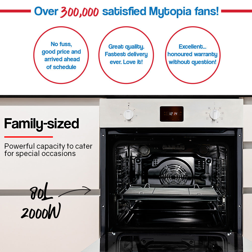 This sleek EuroChef Fan-forced built-in electric oven is highly-efficient has an 80 litre capacity and no less than eight cooking functions to choose from. The EuroChef features a range of clever timer functions and for your peace of mind can be programmed to automatically shut-off in the event of it being left on accidentally.