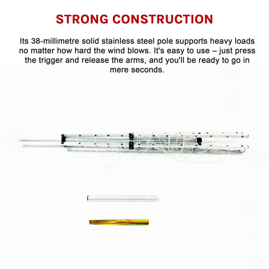 P>Its 38-Millimetre Solid Stainless Steel Pole Supports Heavy Loads No Matter How Hard The Wind Blows. It's Easy To Use €“ Just Press The Trigger And Release The Arms And You'll Be Ready To Go In Mere Seconds. When You're Done Simply Fold Up The Arms Until The Next Time You Do Your Laundry. It's Easy To Install And Even Comes With A Ground Spike So You Can Get It Up And Running Without A Trip To The Hardware Store. With Its Mould-Proof Line You'll Never Have To Worry About Mildewy Laundry Even On Humid Days.P>Features And Specifications:Ul>Li>Material:High-Quality Solid Stainless Steel Pole Pvc-Coated Line And Aluminium ArmsLi>Colour: Matte Silver Black And GreenLi>Steel Thickness: 38MmLi>Line Length: 50MLi>Arm Length: 140CmLi>Arms: 4Li>Accessories: Ground Spike For MountingLi>Deploys In Seconds At The Touch Of A TriggerLi>Mould-Proof Line Resists MildewLi>Rotary Design/Ul>