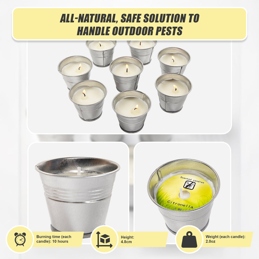 P>These Candles Are All-Natural So You Never Need To Worry About Toxic Fumes Or Harsh Chemicals On Your Skin. Flying Insects Hate The Smell Of Citronella So They Naturally Stay Away From Areas Where They Sense A Citronella Odour. Never Let The Bugs Ruin A Peaceful Warm Evening Again. Order Your Set Of Citronella Candles TodayP>Features And Specifications:Ul>Li>Material: Nature-Sourced Soy Wax Lead-Free Cotton Wick And Lemongrass Essential Oil In A Metal BucketLi>Colour: Silver And WhiteLi>Diameter: Upper 6Cm Lower 4.8CmLi>Height: 4.8CmLi>Weight Each Candle: 2.0OzLi>Quantity: 8Li>Scent: CitronellaLi>Shape: 45-Degree BucketLi>Burning Time Total: 80 HoursLi>Burning Time Each Candle: 10 HoursLi>For Full Coverage Scatter Them Around The Whole AreaLi>Repels Biting Insects Such As MosquitoesLi>All-Natural Safe Solution To Handle Outdoor Pests/Ul>