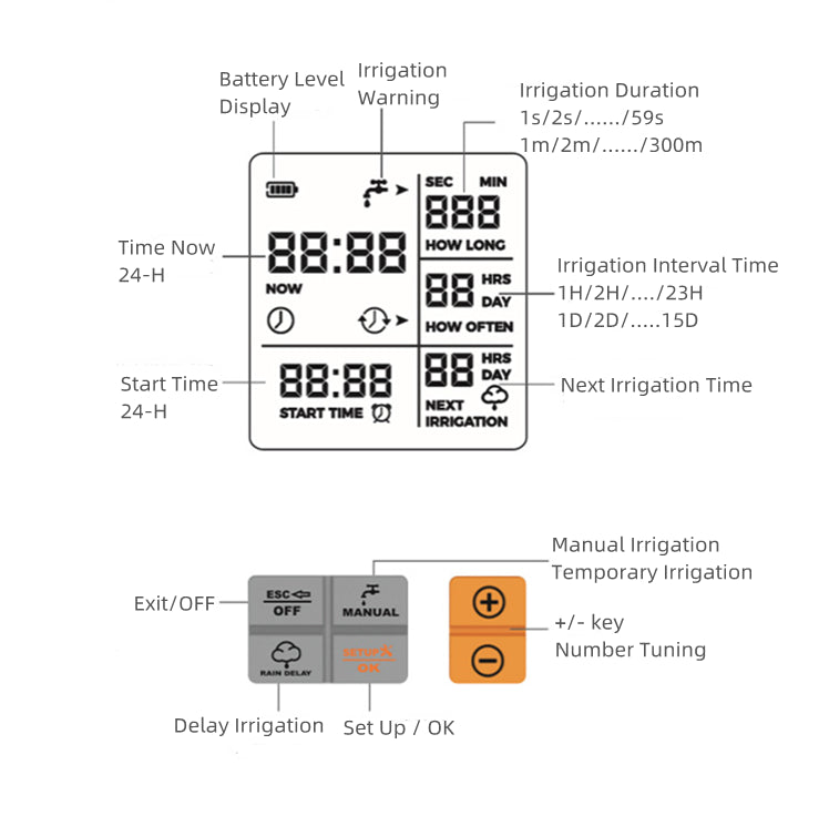 - Programmable Irrigation Cycles From 1 To 300 Minutes