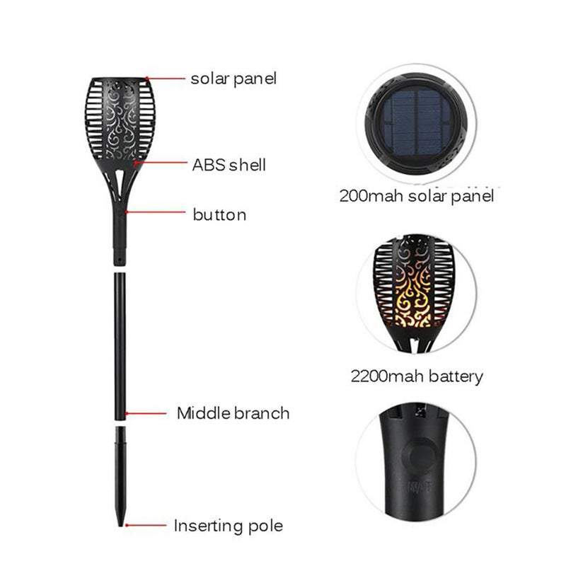 Features: Ip65 Waterproof And Dustproof Design Make It Withstands Rain Hail Snow And Heat. Charge By The Solar Panel During The Day Time And Turn On Automatically At Weak Light. Firm Spike Allows The Torch Insert To The Ground Stably.