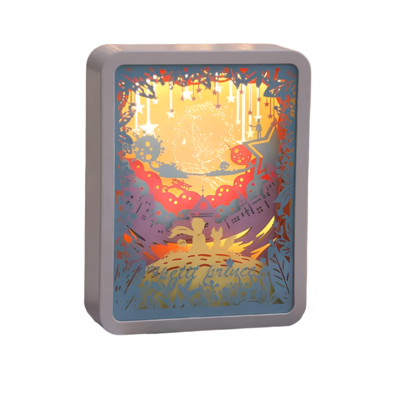 Enhance your room's ambiance with our 3D Paper Carving Night Light. Featuring intricate layered paper designs like the enchanting Starry Night and Little Prince this lamp is perfect for creating a cozy and elegant . Whether placed on a bedside table shelf or used as a gift it brings a touch of artful beauty to any space.