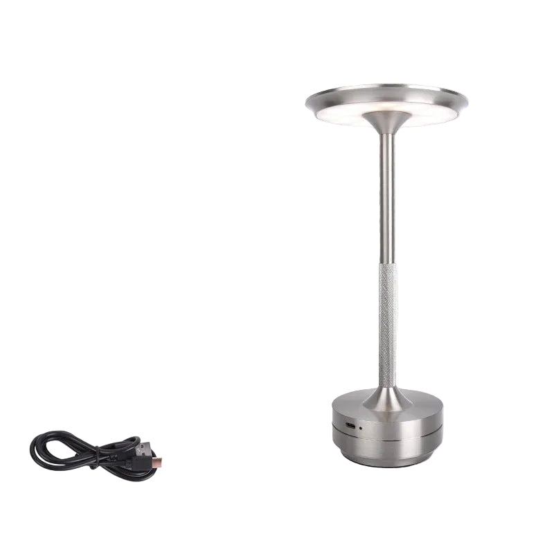 Illuminate Your Space With The Ufo Version Led Desk Lamp A Sleek And Versatile Lighting Solution. This Silver Lamp Features A Touch Switch With Three Color Dimming Options Plus Infinite Dimming Powered By A 1800 Mah Battery For Up To 20 Hours Of Use. It Includes A 50Cm Usb Cable For Convenient Charging And Has A Modern Design With Dimensions Of 280Mm Height 130Mm Top Diameter And 89Mm Base Diameter. Ideal For Home Office Or Bedside Use.