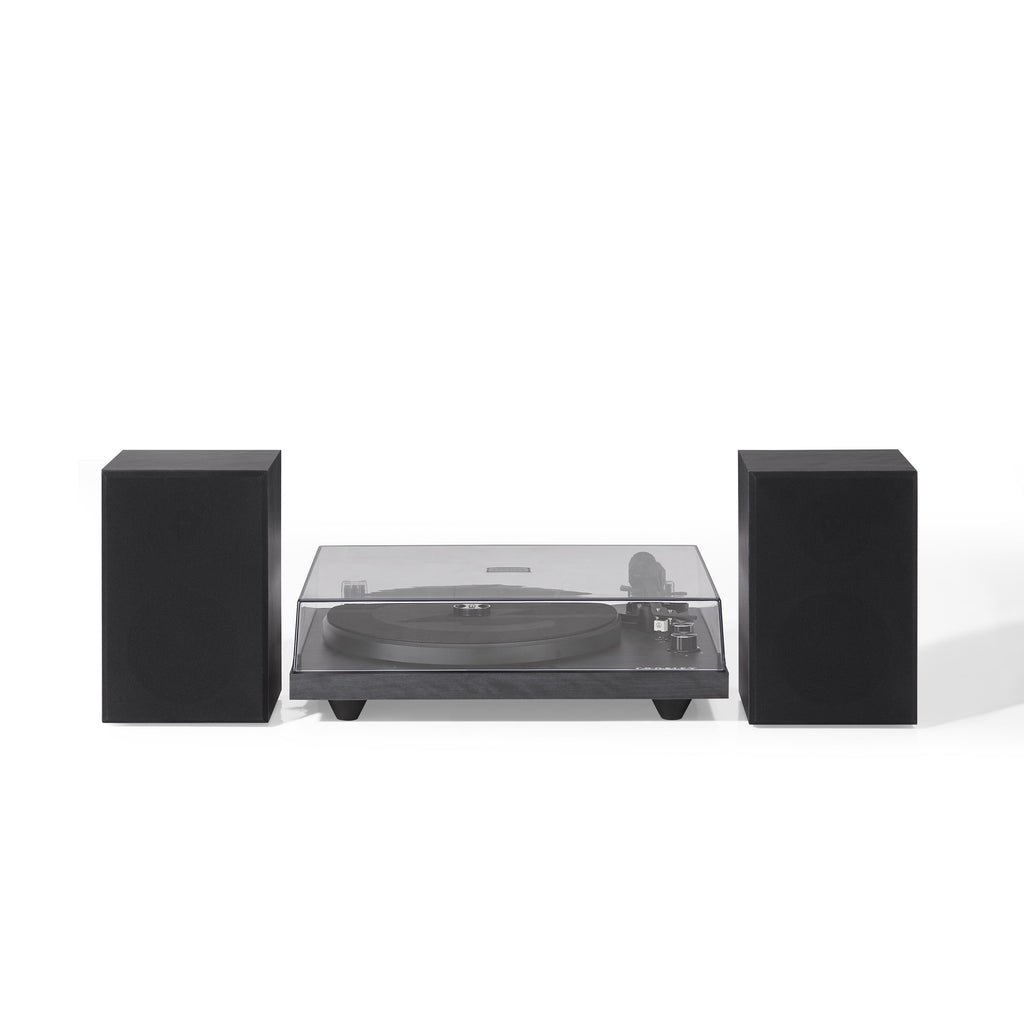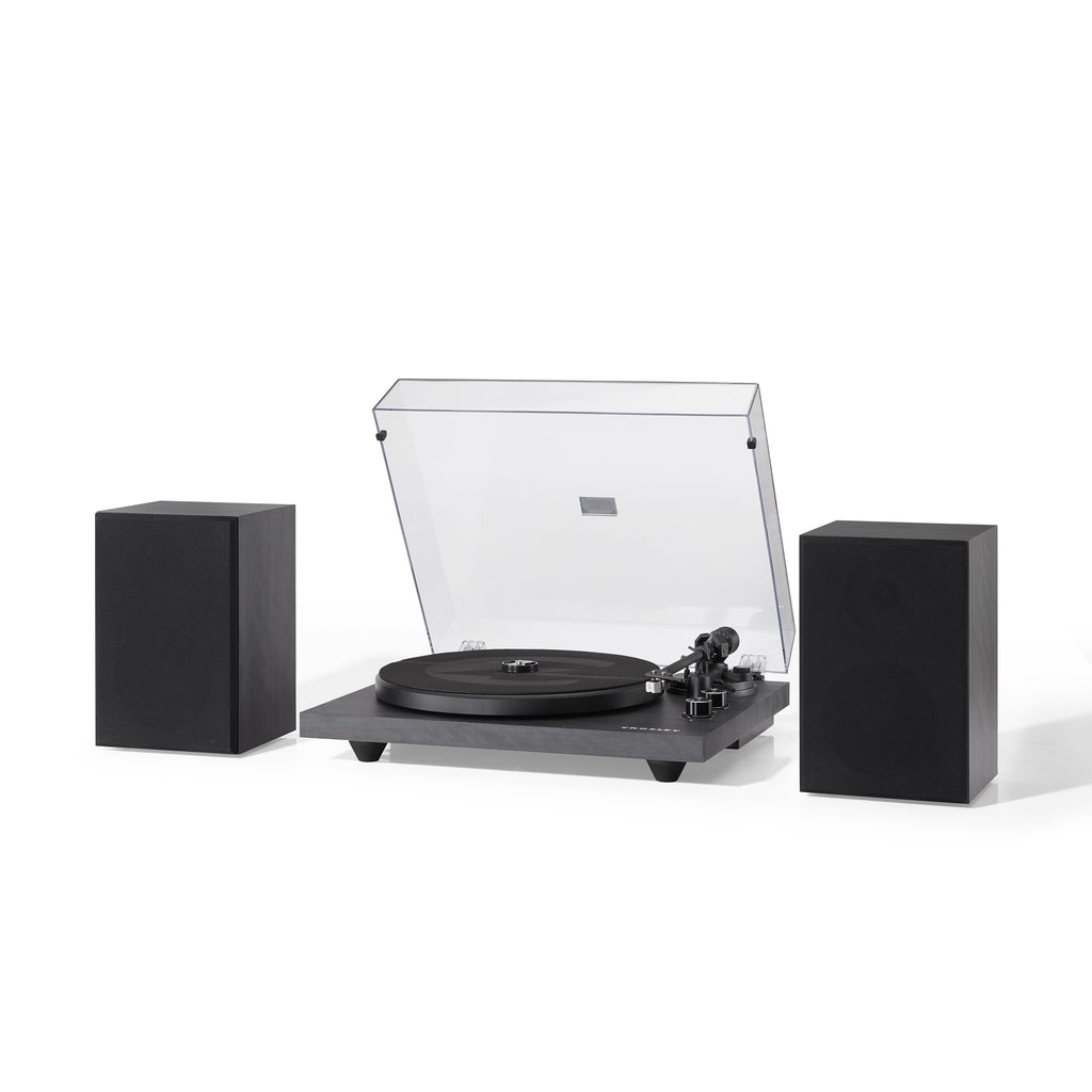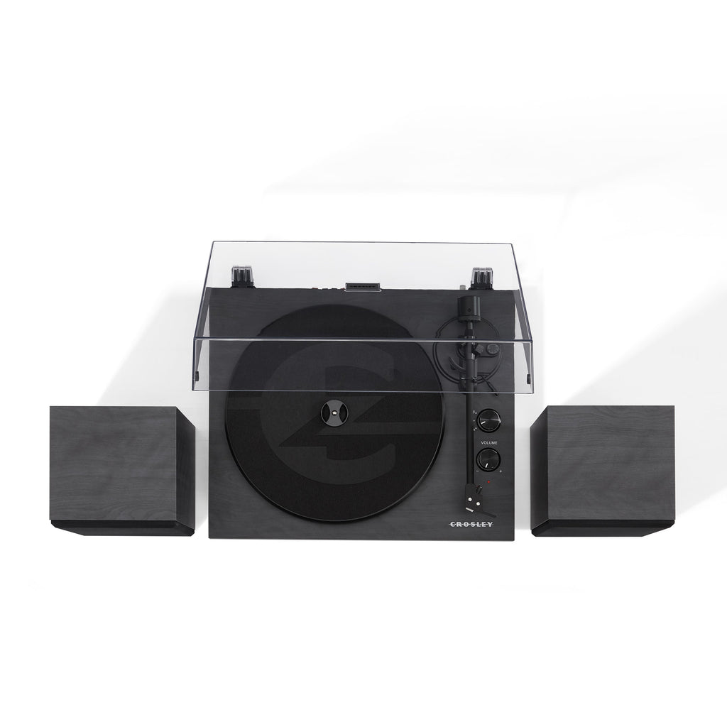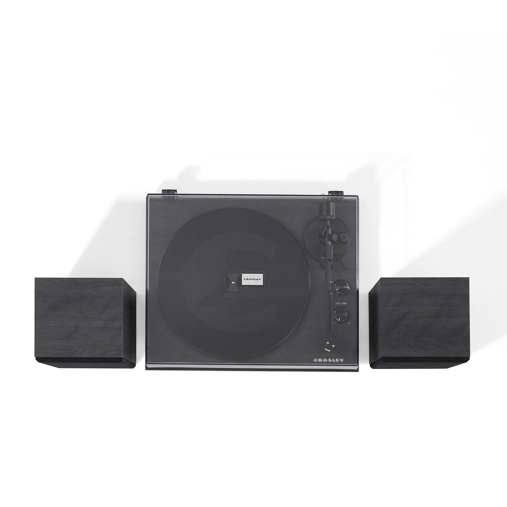 The Crosley C62 In Black Was Designed To Be A Ready-To-Go-Sounds-Darn-Good-Straight-Out-Of-The-Box Turntable System That Doesna€™T Break The Bank. This Fully Manual Two-Speed (33 1/3 45 Rpm) Turntable Sports An Mdf Plinth Wrapped In A Faux Walnut Veneer That Would Fool The Best Of Lumberjacks. AThe Matching Mdf Speakers Look Just As Good As The Turntable And Each Rock A Mid-Range And Tweeter. AThe Matte Black Aluminum Tonearm Has An Counterweight And Comes Pre-Mounted With A Moving Mag - net Cartridge. AOf Course The Cartridge Is Mounted With The Standard 1/2A€ Mount So You Can Always Upgrade Your Cartridge/Stylus Combo As Your Vinyl Collection Grows. AThe Record Sits On A Heavy Steel Platter That Helps Keep The C62 Firmly Planted On Its Three Vibration Control Feet. ATake That RougeaVibrations!A The Super Minimal Two-Knob Design Makes It Easy To Switch Speeds Crank Up The Volume And Switch To The Built-In Bluetooth Receiver If You Want To Stream Music From Your Favorite Digital Playlist. Whether You Live In A Sweet Nyc Loft Or A Teenage Bedroom Filled With Angst The C62 Can Hold Its Own.